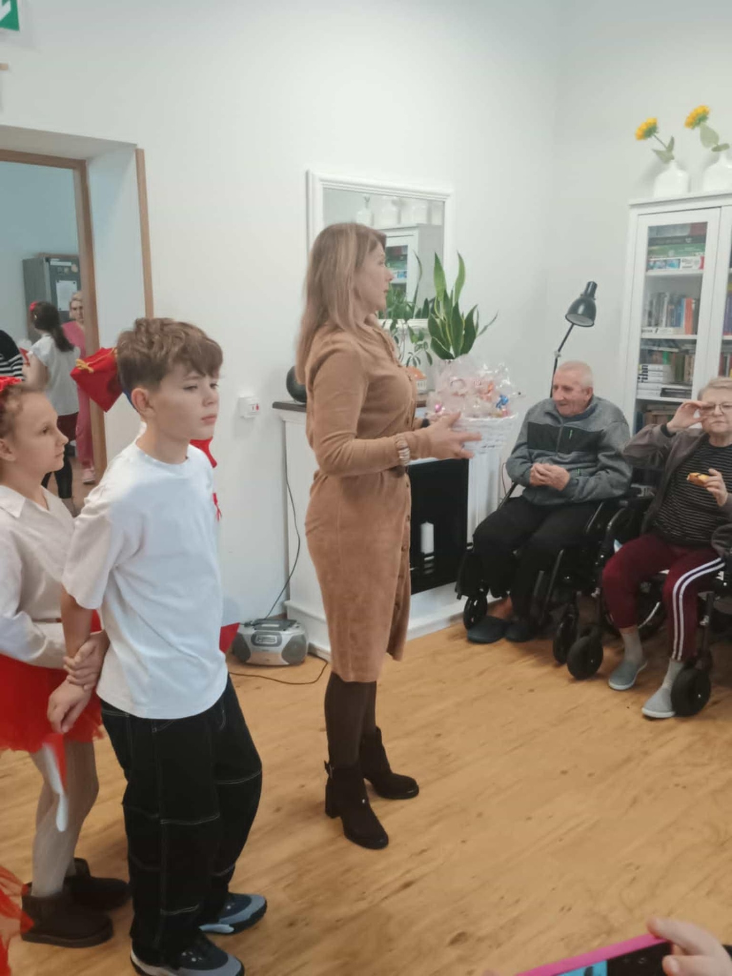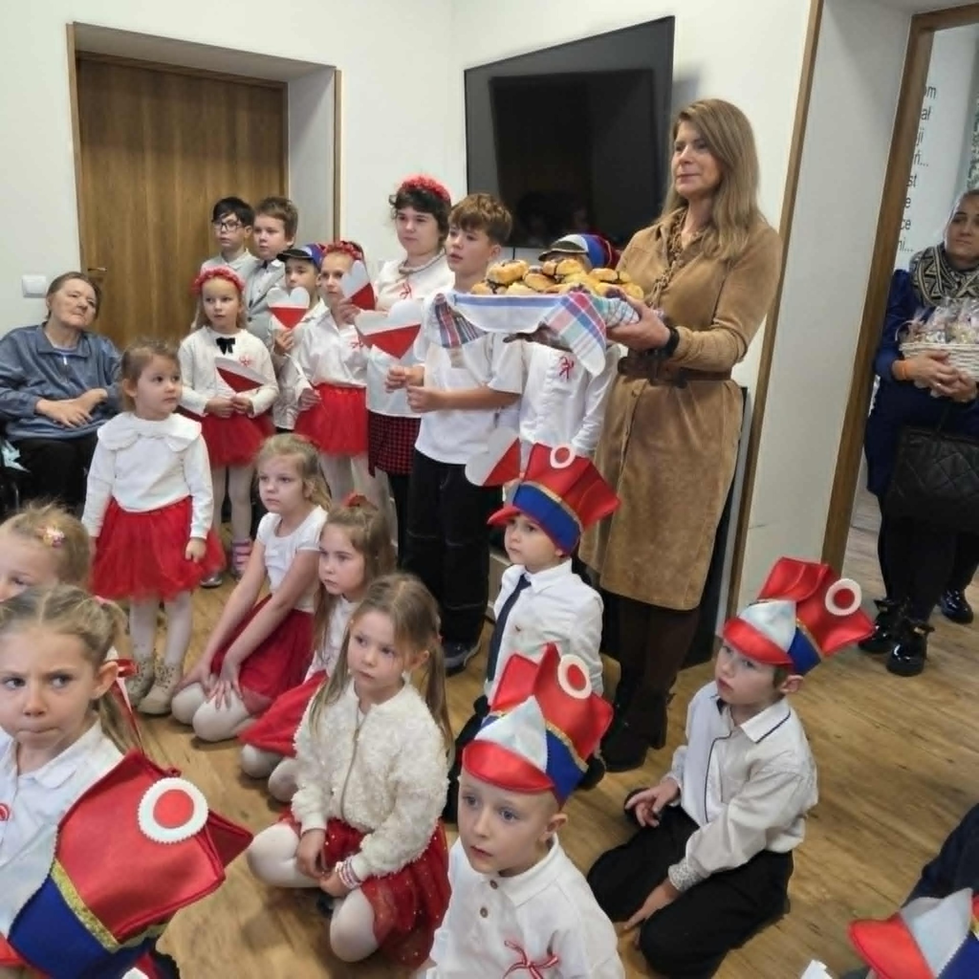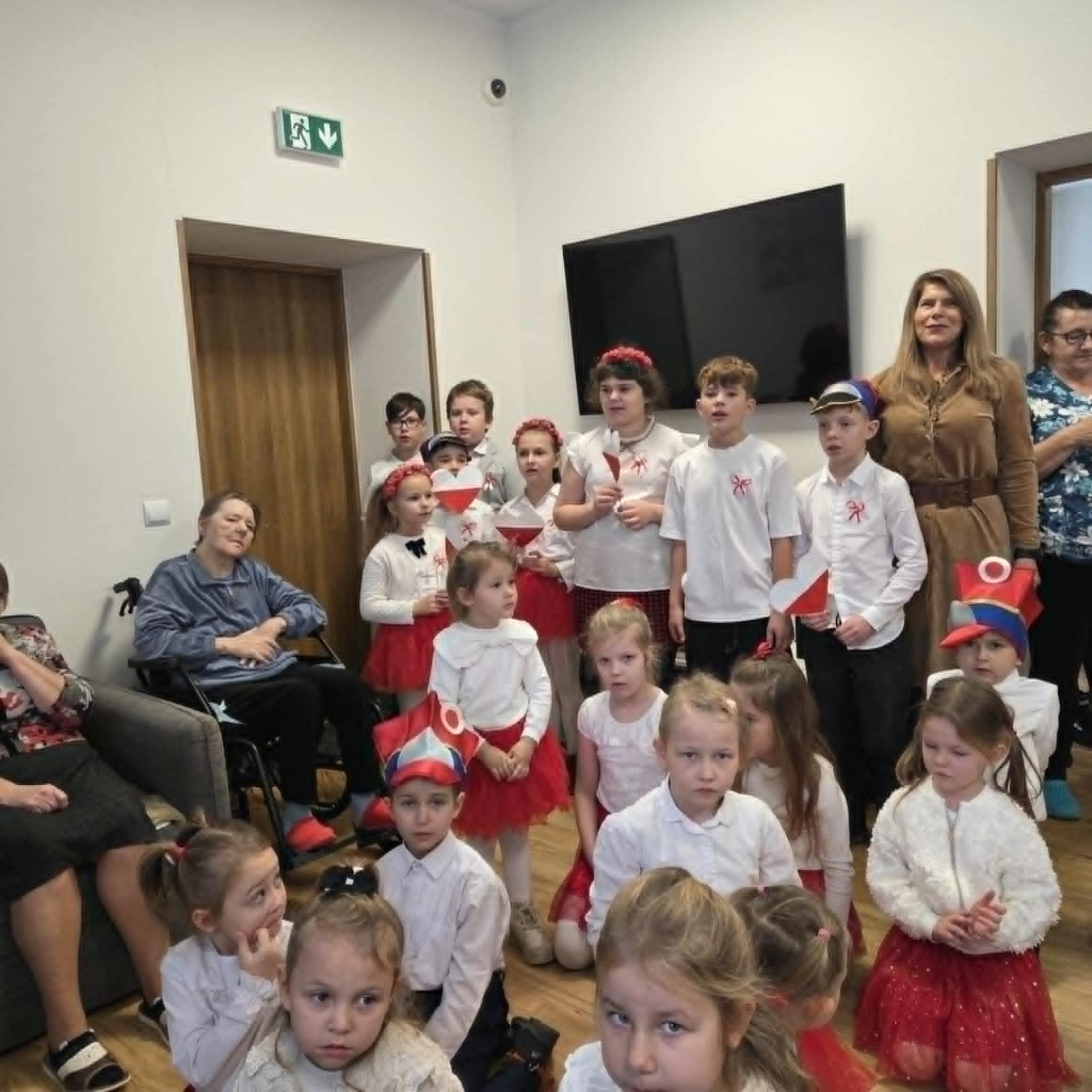 Wspólnie z pensjonariuszami zaśpiewaliśmy pieśni bliskie każdemu Polakowi: „Rotę”, „Piechotę” oraz „My, Pierwsza Brygada”. Dzieci zaprezentowały również układ taneczny z biało-czerwonymi flagami, a pięknie wypowiedziany „Katechizm polskiego dziecka” poruszył serca wszystkich obecnych. W sali zapanowało prawdziwe wzruszenie, ale też ciepło, bliskość i iskierka radości, której tak bardzo potrzeba w takich miejscach.