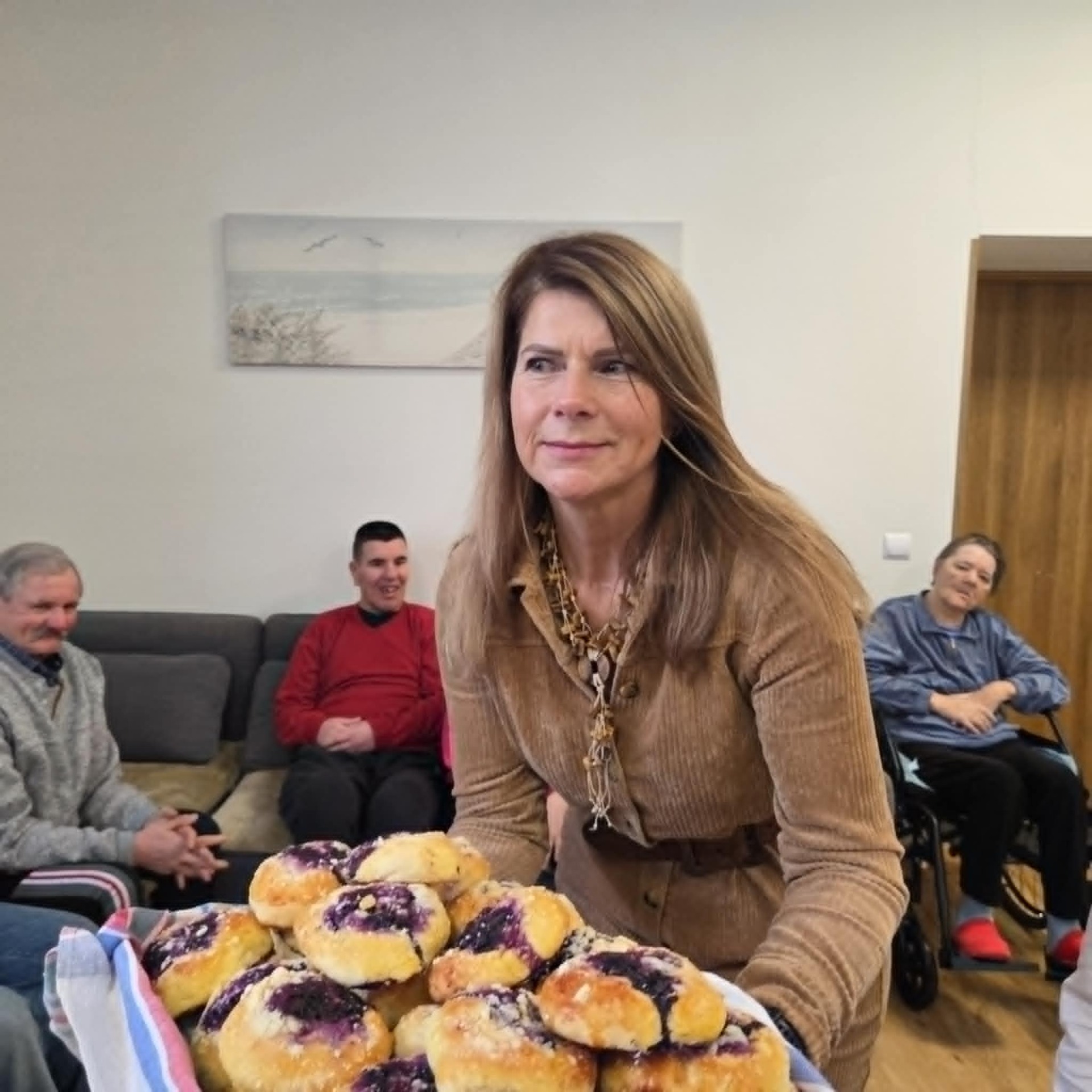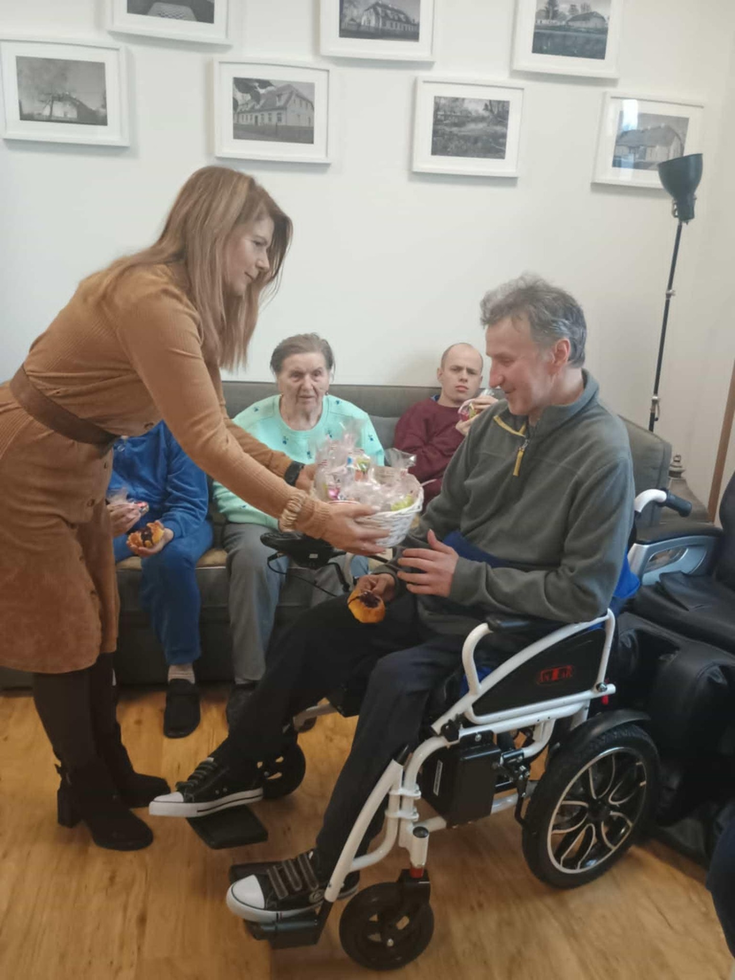 Tym razem nie pojechaliśmy z pustymi rękami – dla pensjonariuszy przygotowane zostały pyszne drożdżówki z borówkami oraz słodkie upominki, które wywołały na twarzach seniorów szczere uśmiechy.